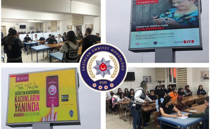 Erzincan İl Emniyet Müdürlüğü Tercan İlçe Emniyet Müdürlüğü personeli tarafından önleyici polislik faaliyetleri kapsamında, Kades,Telefon Dolandırıcılığı,Sosyal Medya,Burs Vaadiyle Yapılan Dolandırıcılık,konuları hakkında öğrencileri bilgilendirdi.